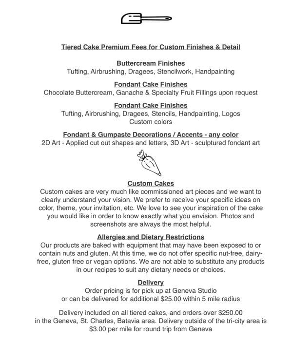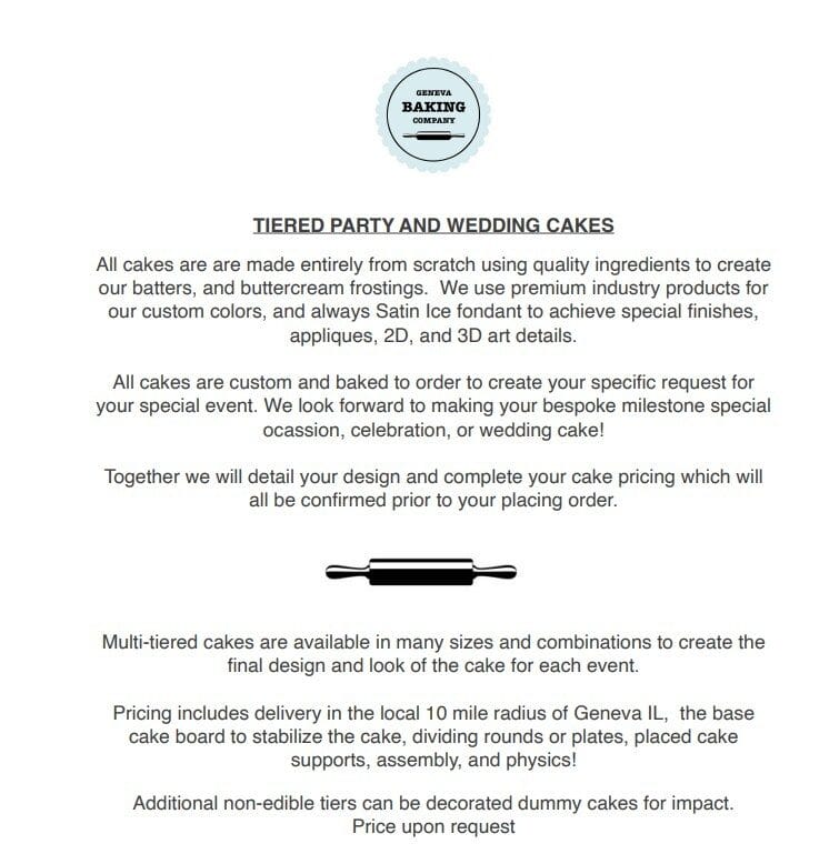 Custom cakes are very much like commissioned art pieces and we want to clearly understand your vision. We prefer to receive your specific ideas on color, theme, your invitation, etc. We love to see your inspiration of the cake you would like in order to know exactly what you envision. Photos and screenshots are always the most helpful.
