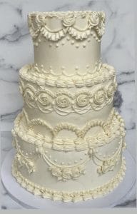 A love letter to vintage weddings, Avignon is adorned entirely in hand-piped buttercream — delicate swags, scalloped shells, and ornate scrollwork that echo the timeless charm of old-world celebrations. This nostalgic design brings warmth, tradition, and artistry to the forefront, perfect for couples who treasure romance with a sense of history.