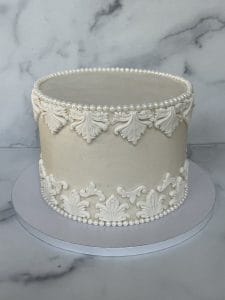 Inspired by Renaissance grandeur, Florence features intricate baroque scrollwork and fondant appliqué details, creating a subtle two-dimensional damask texture in all white. A sugar pearl-trimmed edge and base add a soft, luminous finish to this sculptural design. Elegant and artistic, this cake is perfect for couples drawn to timeless beauty, classical architecture, and romantic Italian refinement.