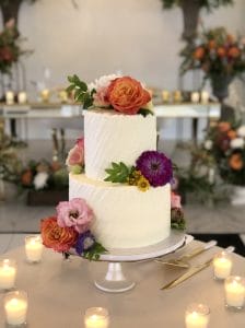 Bursting with fresh florals and radiant color, Capri Fiore channels the charm of an Italian summer celebration. This two-tiered cake features a lightly textured horizontal buttercream finish and cascading garden blooms in rich jewel tones — coral, fuchsia, golden yellow, and violet — for a look that’s both effortlessly romantic and delightfully bold. Ideal for outdoor weddings, flower-filled venues, or couples who love color.